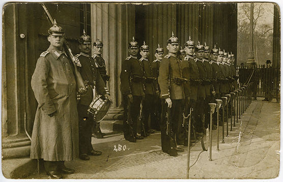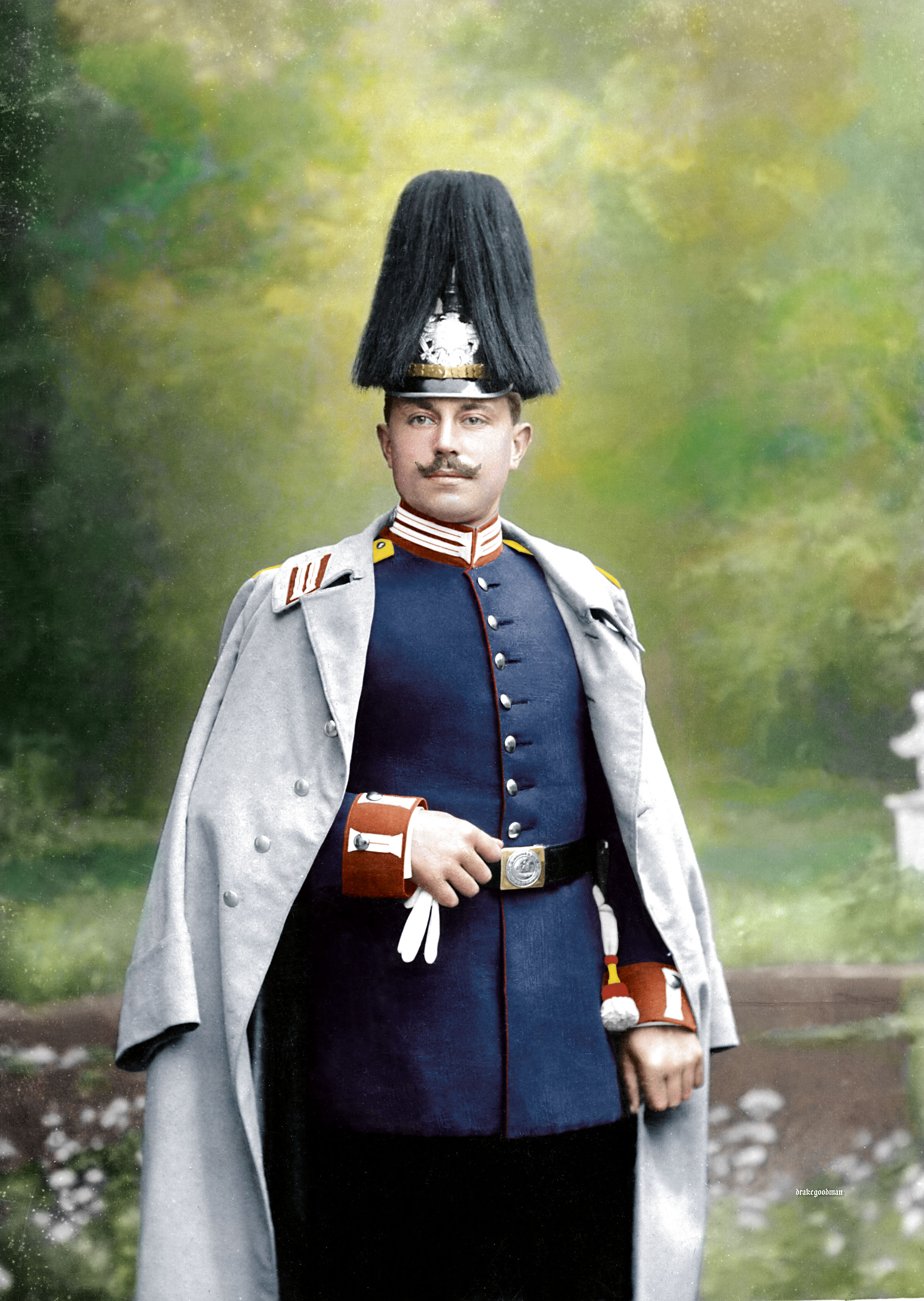 Un caporal du Garde Fusilier Regiment de la 10e compagnie en uniforme de parade chez le photographe. Le régiment