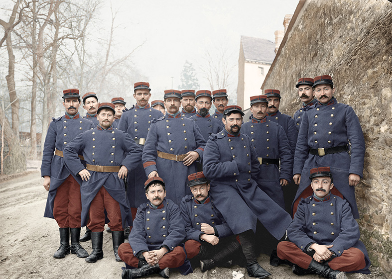 der Eroberung. Der erste Soldat ist ein Unteroffizier. Vor ihm liegt die Leiche eines französischen Soldat, der schon