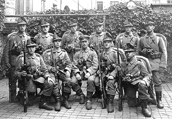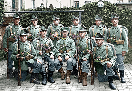 d'Oberjäger (sergent). Avant de partir pour le front, en compagnie de leur instructeur (assis au centre), ils profitent pour