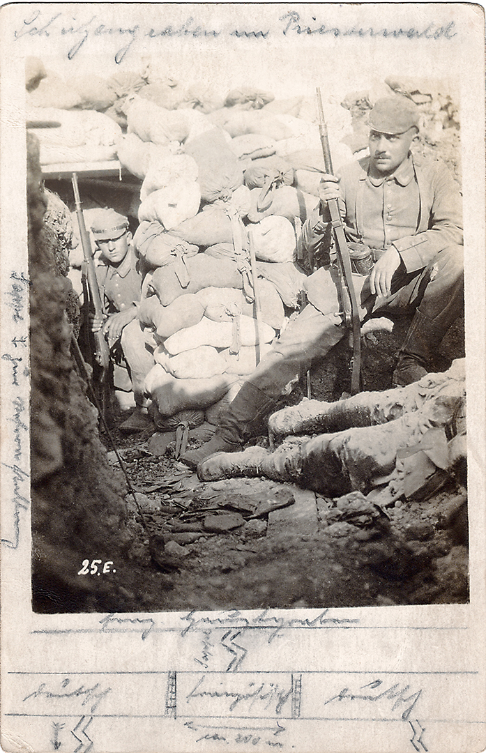 dernière. Le premier homme porte le grade d'Unteroffizier. À ses pieds un cadavre de soldat français, qui est déjà