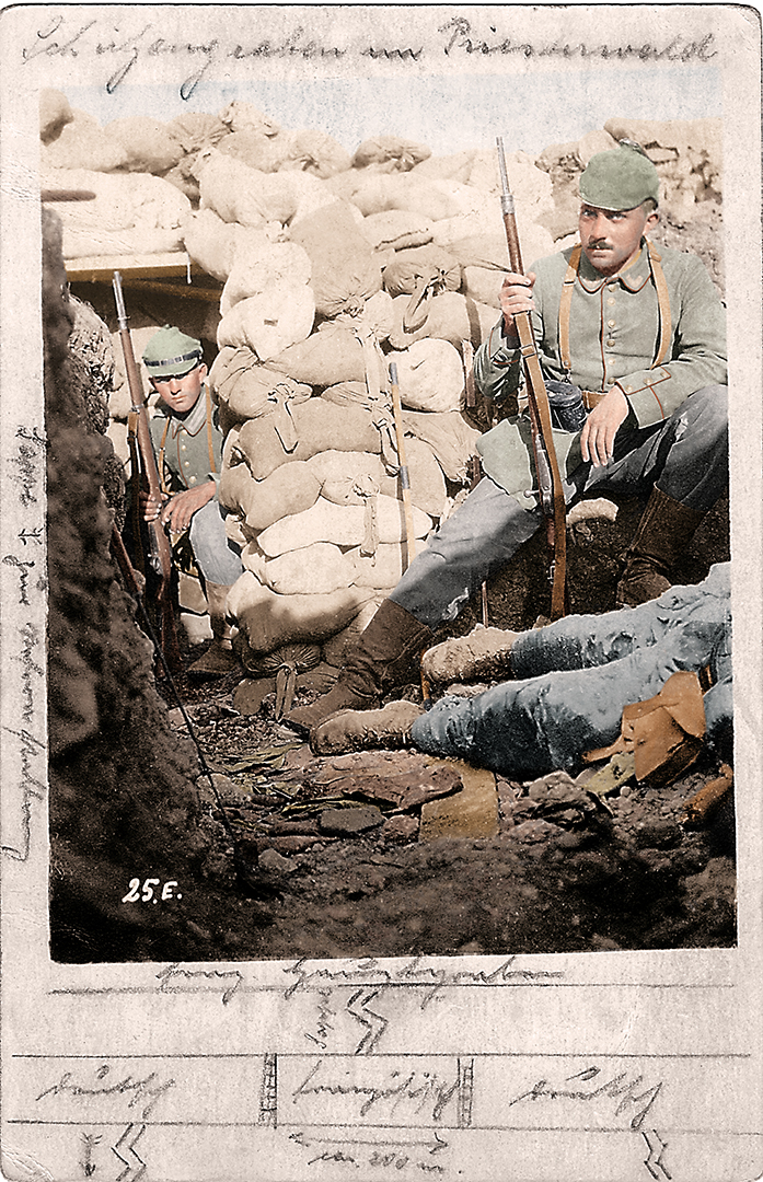 France Bois le Prêtre, été 1915. Deux soldats allemands dansune tranchée, surement après la conquête de cette