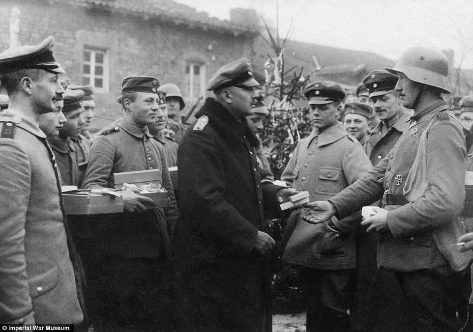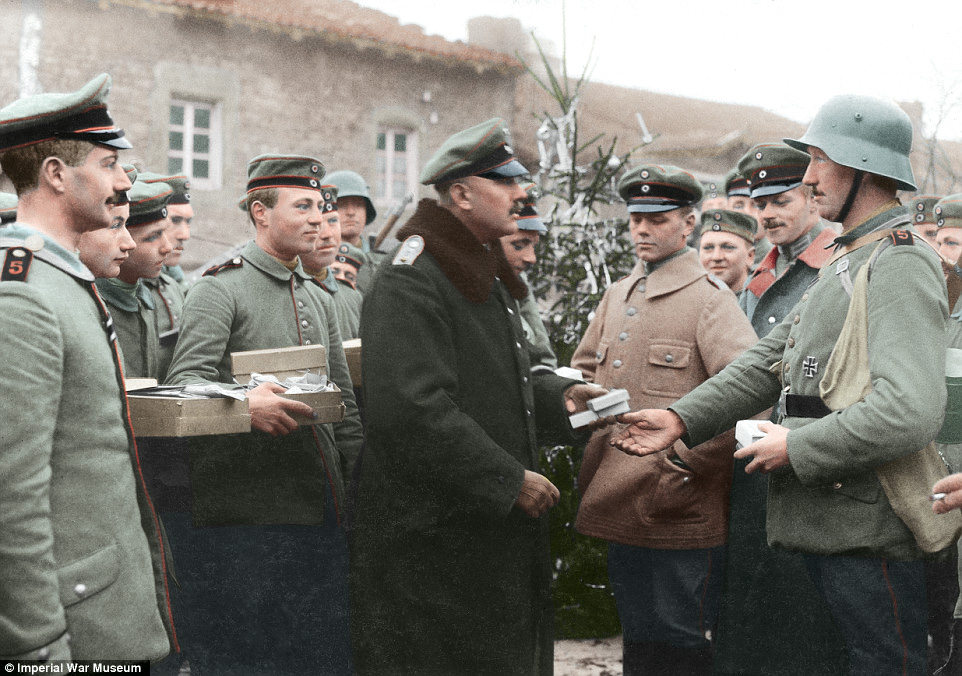 benutzt. Es lag günstig hinter der Frontlinie. Der Offizier im dunkel Wintermantel, der seiner Leute Geschenke verteilt ist