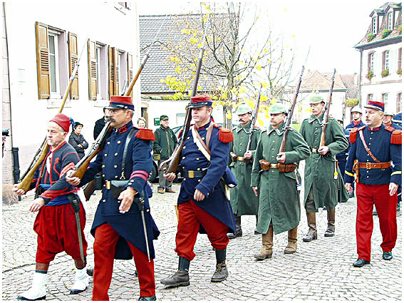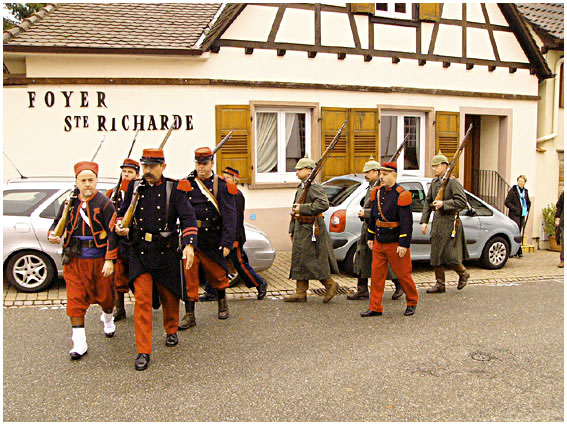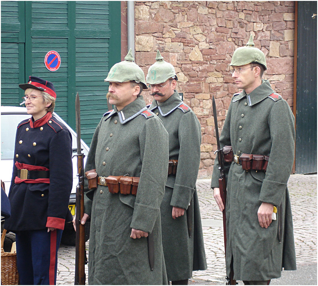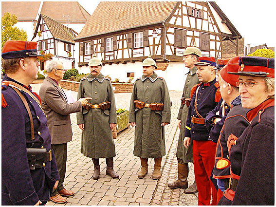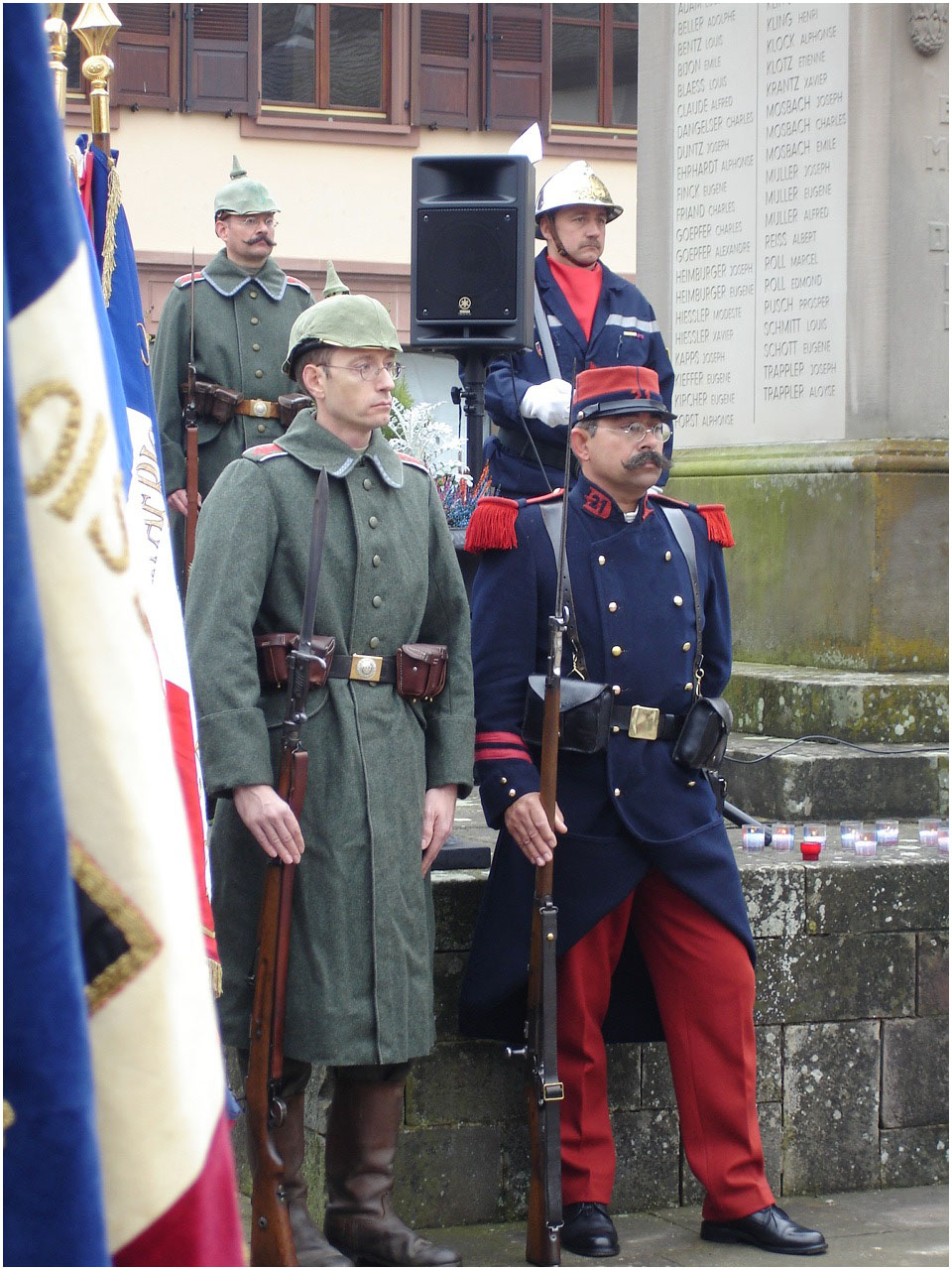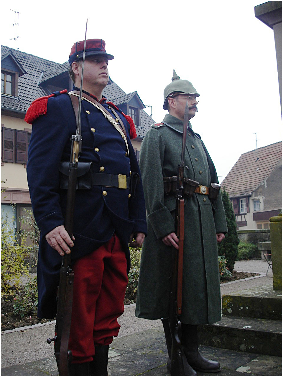 am örtlichen Kriegerdenkmal gemeinsam mitzugestalten. Franzosen und Deutsche in historischen Uniformen.
