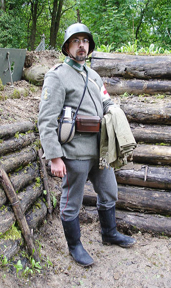 Au cou, une Halsbinde de couleur grise. Les pantalons gris-pierre et les bottes de marche. Le ceinturon de cuir noir.
