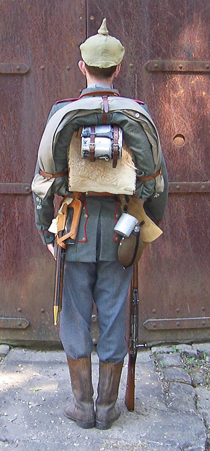 À l'arrière, le sac à dos modèle 1907/13 avec la gamelle, le manteau gris et la toile de tente.