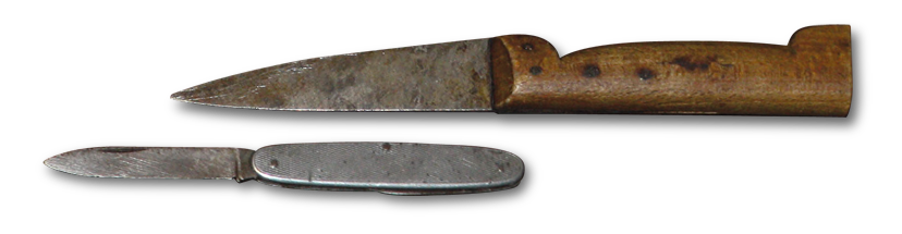 Bild unten: ein Küchenmesser und das von der Armee ausgeteilte Taschenmesser dienten meistens als erste Grabendolche.