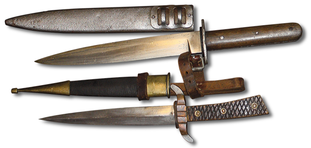 auf vorhandene und privat beschaffte Dolche und Messer zurückgegriffen werden. Aber auch in Feldschmieden und Werkstätten an und hinter der Front wurden Behelfswaffen hergestellt. Beispielsweise bot sich hier die messerartige Verkürzung der Bajonette an.